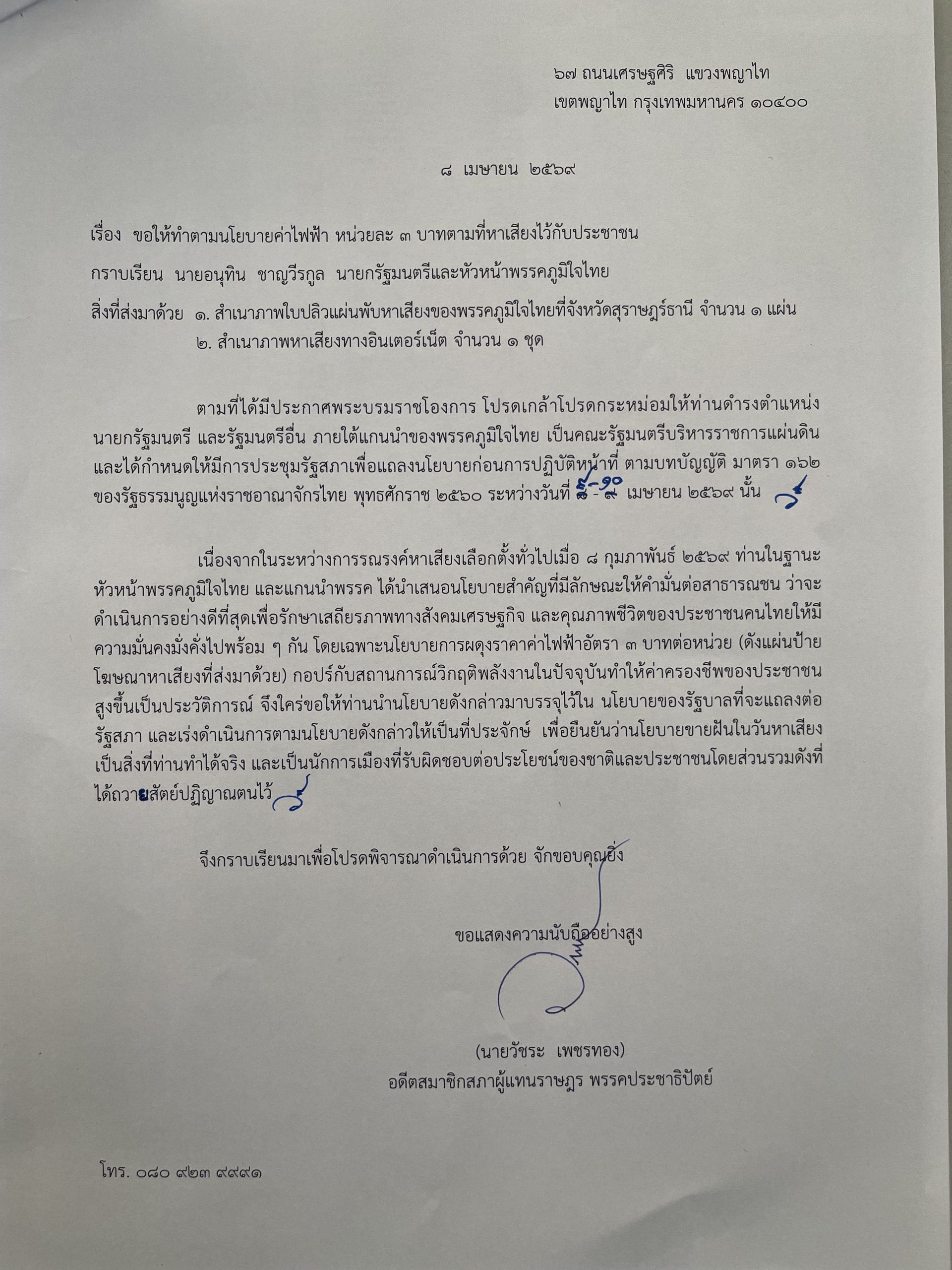 “วัชระ” ทวงค่าไฟฟ้าหน่วยละ 3 บาท จากนายกฯ อนุทิน พรรคภูมิใจไทย ระบุคำแถลงนโยบาย 78 หน้า ไม่ใส่ไว้ตามที่หาเสียงส่อหลอกลวงประชาชน!
