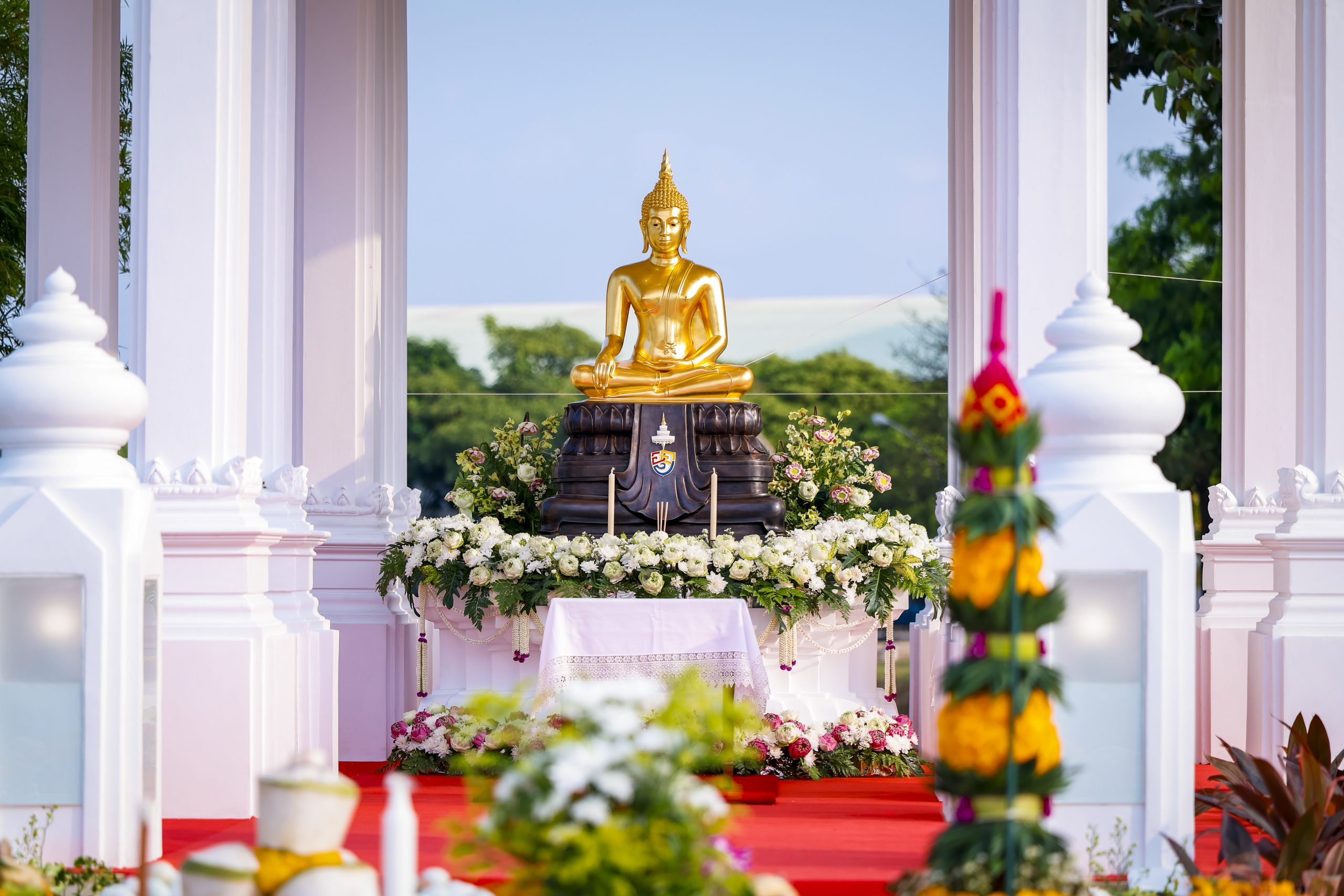 พิธีดังกล่าวนี้ สมเด็จพระมหาวีรวงศ์ เลขานุการสมเด็จพระสังฆราช เป็นประธานฝ่ายสงฆ์ ประกอบพิธีสมโภชและอัญเชิญพระพุทธรูปขึ้นประดิษฐาน ซึ่งอาจารย์ฉัตรชัย ปิ่นเงิน หัวหน้างานโหรพราหมณ์ กองพระราชพิธี สำนักพระราชวัง ร่วมประกอบพิธีบวงสรวงตามราชประเพณีอย่างครบถ้วนสมบูรณ์