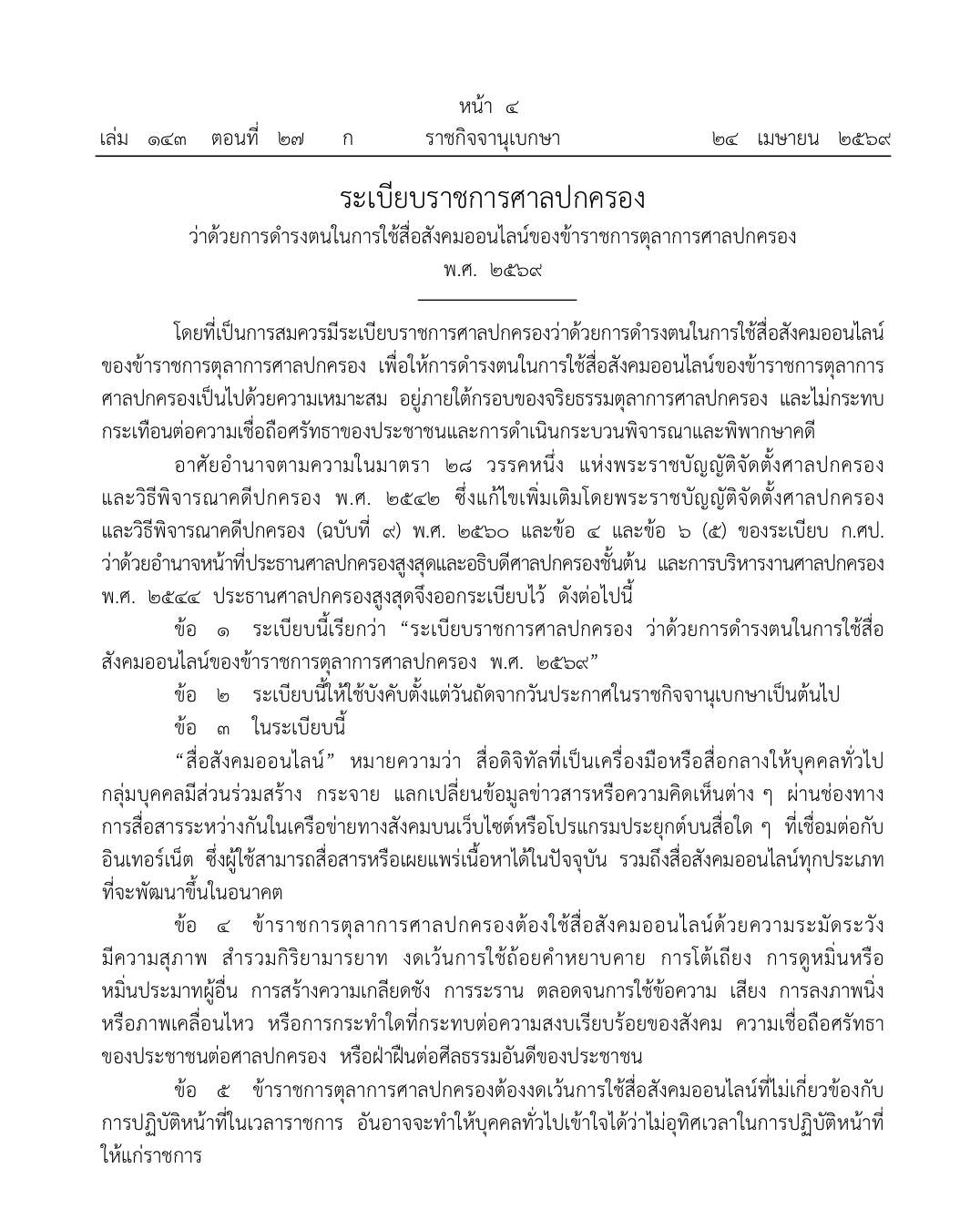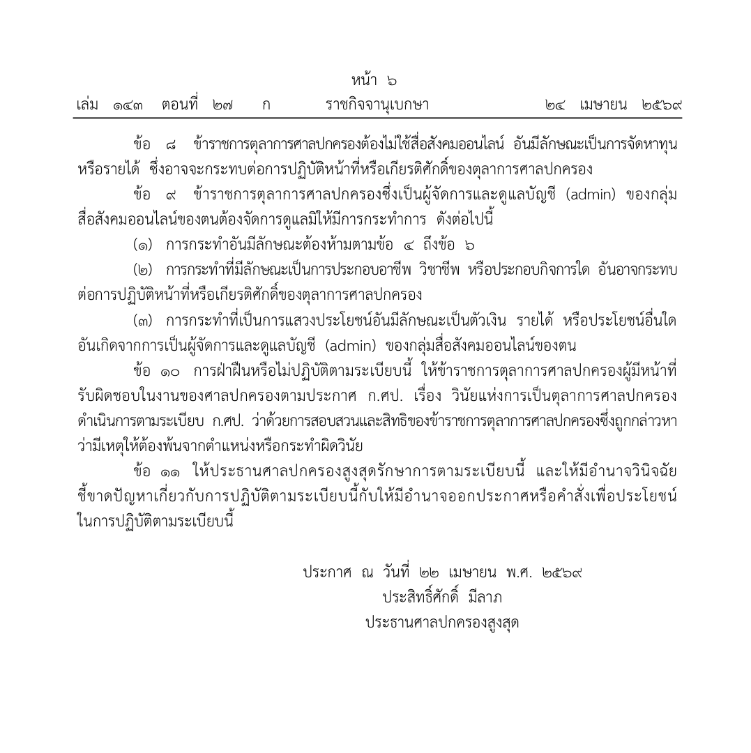 ๒๗ เมษายน ๒๕๖๙ เว็บไซต์ราชกิจจานุเบกษา เผยแพร่ระเบียบราชการศาลปกครอง ว่าด้วยเรื่องการดำรงตนในการใช้สื่อสังคมออนไลน์ของข้าราชการตุลาการศาลปกครอง พ.ศ. ๒๕๖๙ โดยใจความระบุ…