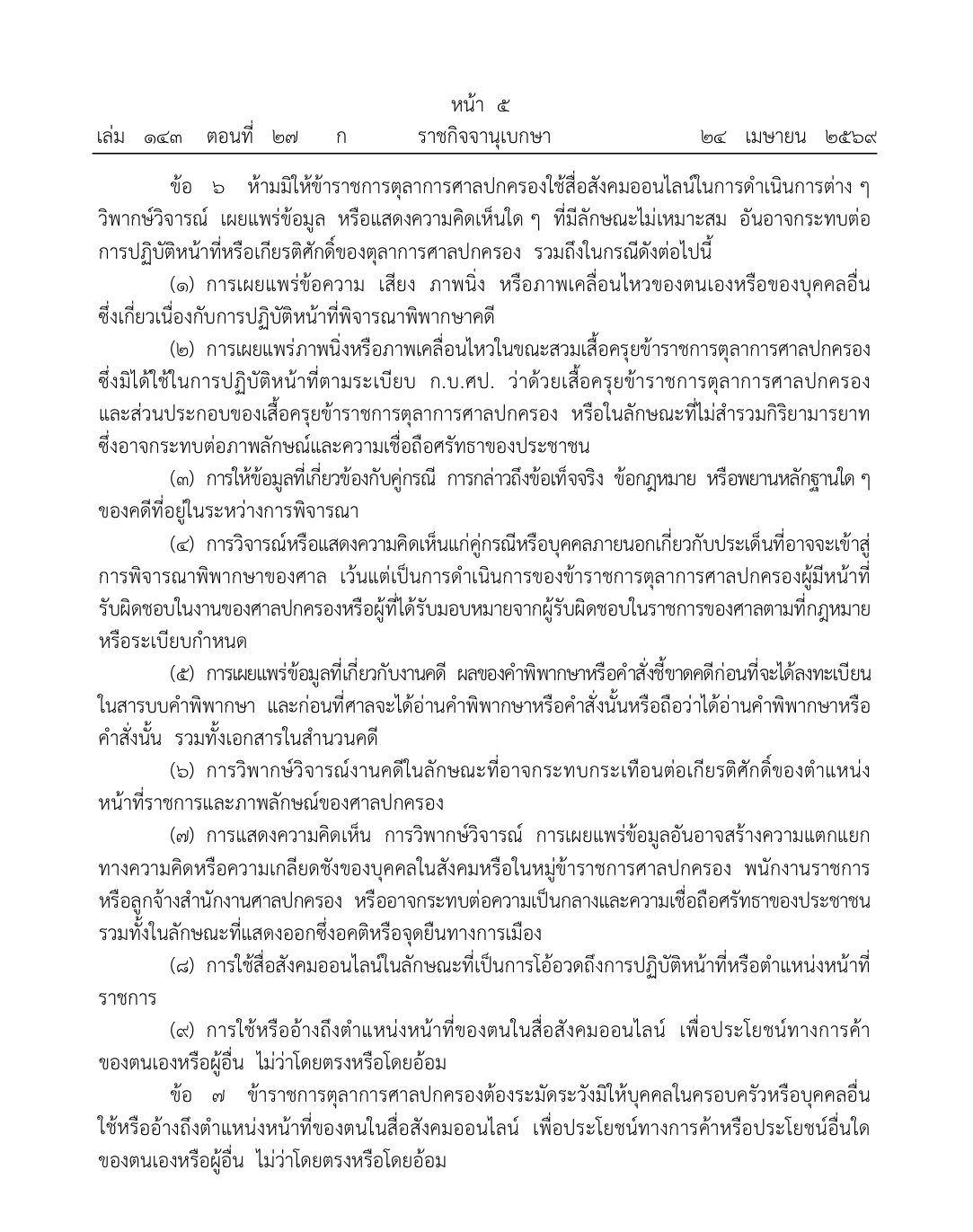 ข้อ ๕ ข้าราชการตุลาการศาลปกครองต้องงดเว้นการใช้สื่อสังคมออนไลน์ที่ไม่เกี่ยวข้องกับการปฏิบัติหน้าที่ในเวลาราชการ อันอาจจะทำให้บุคคลทั่วไปเข้าใจได้ว่าไม่อุทิศเวลาในการปฏิบัติหน้าที่ให้แก่ราชการ