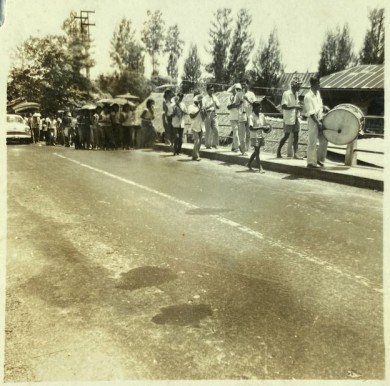 ขบวนแห่นาคกำลังเดินข้ามคลองบางนามายังวัดบางนาใน เมื่อปี 2500