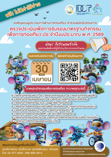 วว. จับมือกรมการท่องเที่ยว เชิญชวนผู้ประกอบการร่วมสมัคร โครงการตรวจประเมินรับรองมาตรฐานกิจกรรมเพื่อการท่องเที่ยว ฟรี!