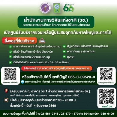 “สำนักงานการวิจัยแห่งชาติ” เปิดศูนย์รับบริจาคช่วยเหลือผู้ประสบอุทกภัยหาดใหญ่และภาคใต้