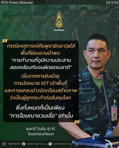 พลตรี วินธัย สุวารี โฆษกกองทัพบก เผย เหตุการณ์กัมพูชายิงอาวุธหลายขนาดใส่พื้นที่ช่องอานม้า เป็นการ “การสร้างสถานการณ์” ของฝ่ายกัมพูชา